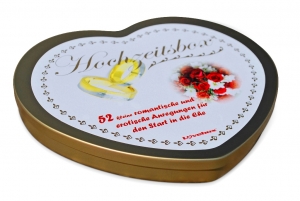 Die Hochzeitsbox als Hochzeitsgeschenk Das romantische Geschenk an das Brautpaar zum schönsten Tag des Lebens. Mit der persönlichen Hochzeitsbox beweisen Sie, dass Sie sich für diesen Ehrentag auf alle Fälle ganz besondere Gedanken gemacht haben. Ob als Geschenk als Freund an das Hochzeitspaar oder als Bräutigam an die Braut. Mit der Hochzeitsbox gibt es noch die besondere Zugabe. In der Hochzeitsbox ist alles schon für sie vorbereitet, damit es ein bischen leichter fällt. Natürlich füllen Sie jedes einzelne Los selbst aus, aber wir haben Ihnen auf einem Extrablatt schon jede Menge Anregungen, was man schreiben könnte beigelegt.